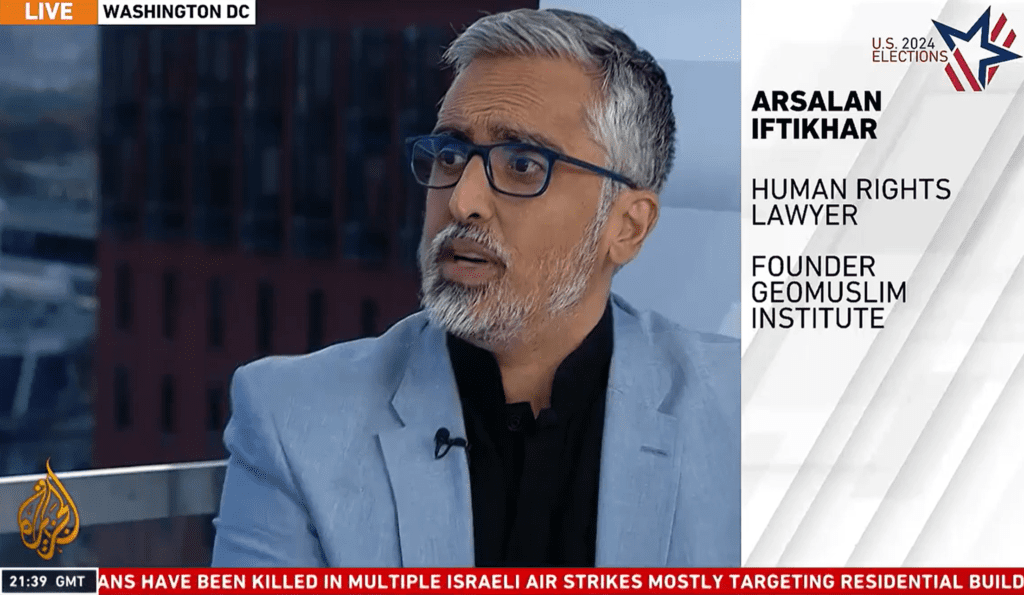 GeoMuslim Institute (GMI) founder & human rights lawyer Arsalan Iftikhar interviewed on Al-Jazeera English live global broadcast during Election 2024 coverage discussing whether Donald Trump is a threat to democracy. (October 29, 2024)